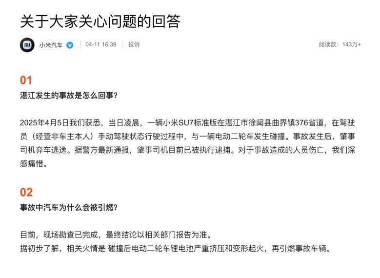 南都记者注意到,4月11日,小米汽车在微博回应称,4月5日获悉,当日凌晨,一辆小米SU7标准版在湛江市徐闻县曲界镇376省道,在驾驶员(经查非车主本人)手动驾驶状态行驶过程中,与一辆电动二轮车发生碰撞。事故发生后,肇事司机弃车逃逸。据警方最新通报,肇事司机目前已被执行逮捕。“对于事故造成的人员伤亡,我们深感痛惜。”