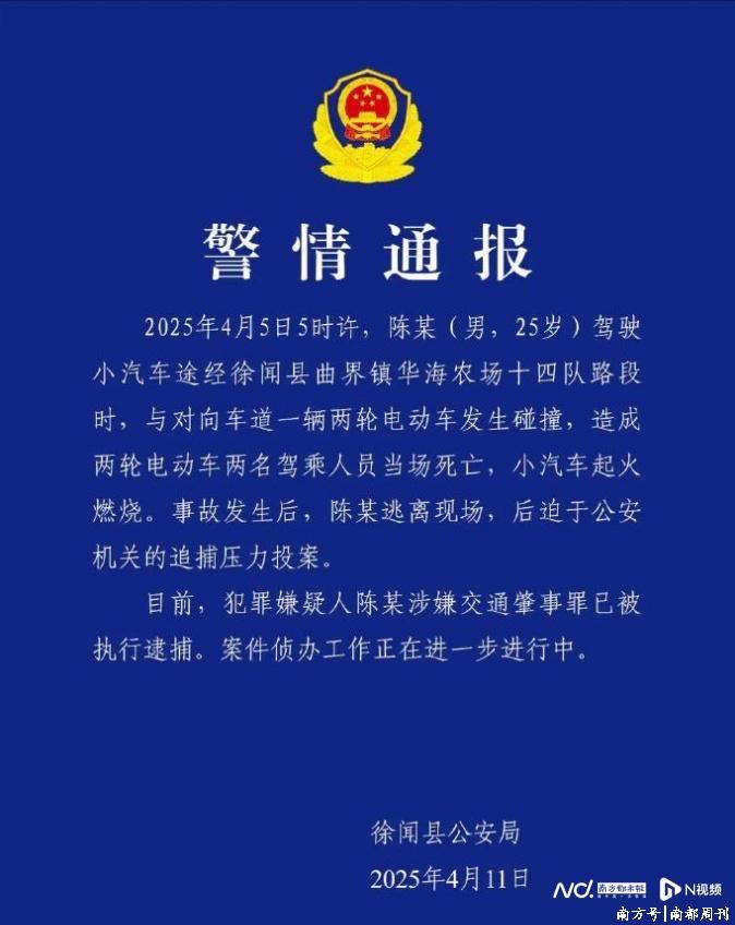 据徐闻县公安局通报,4月5日5时许,陈某(男,25岁)驾驶小汽车途经徐闻县曲界镇华海农场十四队路段时,与对向车道一辆两轮电动车发生碰撞,造成两轮电动车两名驾乘人员当场死亡,小汽车起火燃烧。事故发生后,陈某逃离现场,后迫于公安机关的追捕压力投案。